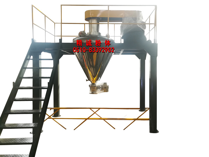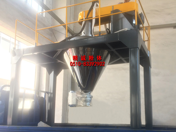 產(chǎn)品通過錐形混合腔頂部投入,投料范圍在30%-99.99%之間,設(shè)備中間有一個(gè)頂部驅(qū)動(dòng)的高速轉(zhuǎn)軸,因此便去除了在產(chǎn)品區(qū)域的密封設(shè)計(jì)以及軸承。在軸上有緊貼內(nèi)壁的槳式混合原件。通過高速旋轉(zhuǎn)的攪拌槳和錐形內(nèi)倉的共同作用將產(chǎn)品由底部帶至混合腔的上部。當(dāng)產(chǎn)品達(dá)到頂部的時(shí)候又重新回落到混合倉中心,如此的產(chǎn)品的方式形成了一種快速的宏觀混合。